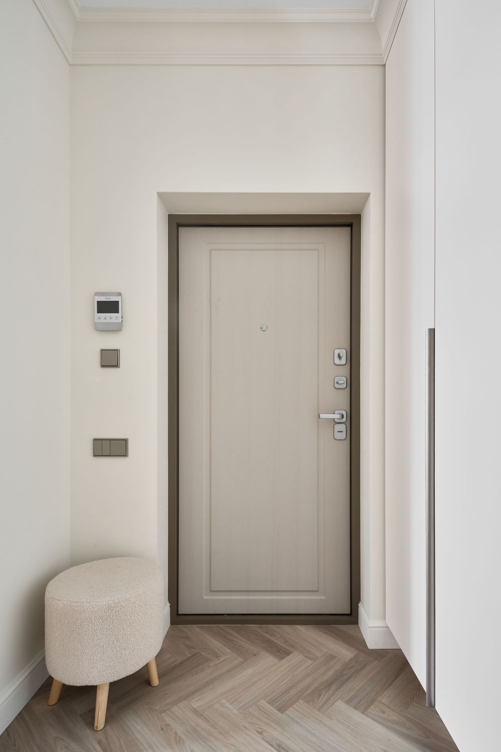 Элегантная деталь - пол, уложенный «ёлочкой», он связывает интерьер в единое целое и придаёт ощущение сдержанной, спокойной роскоши.